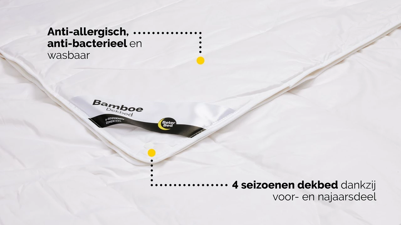 Het dekbed is gevuld met 100% viscose gemaakt van bamboevezels. Bamboe is een erg licht en zacht materiaal. Het dekbed heeft een uitstekende ventilatie, werkt erg vochtabsorberend en voelt super zacht aan. Dit dekbed bestaat uit een voor-/najaarsdeel met warmteklasse 2 en een zomerdeel met warmteklasse 4. Daardoor heb je ieder seizoen het juiste dekbed.