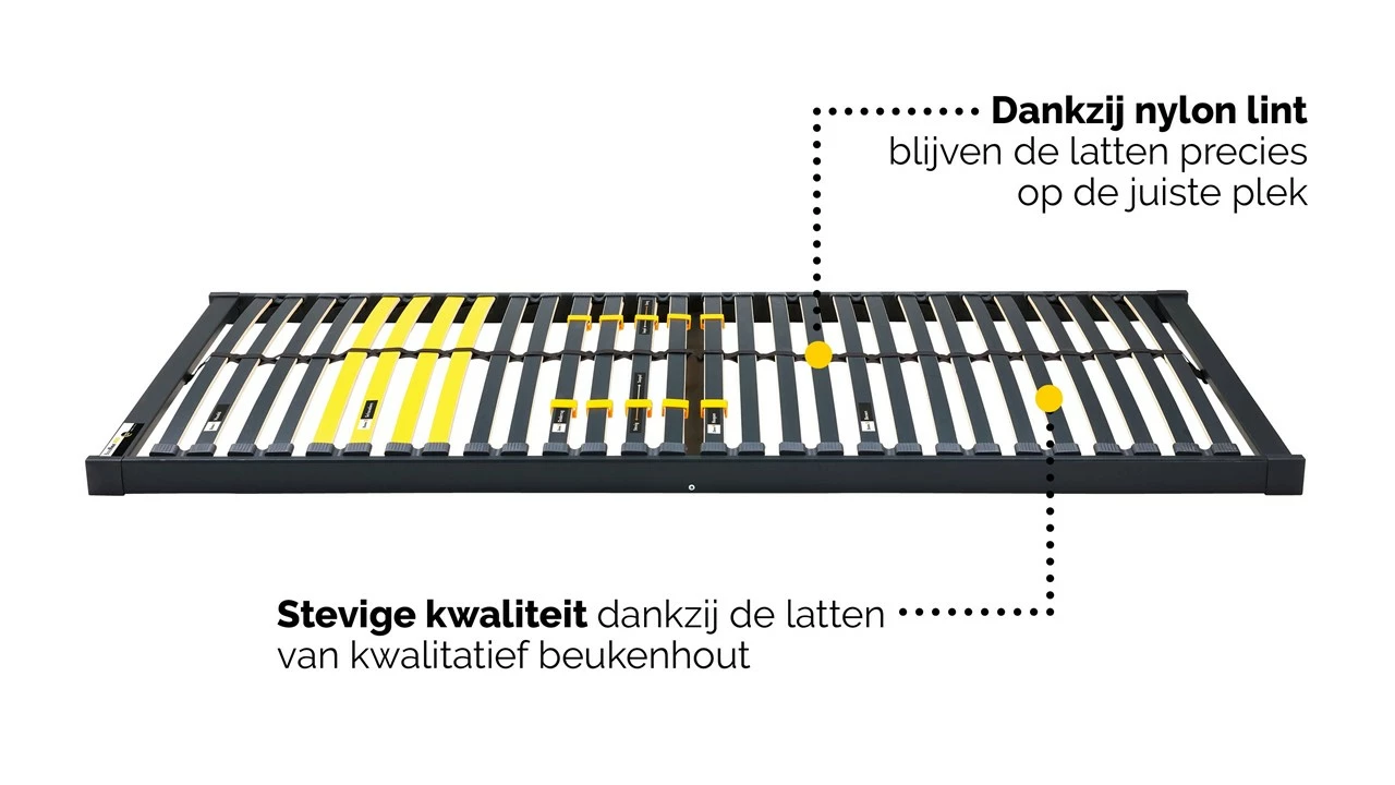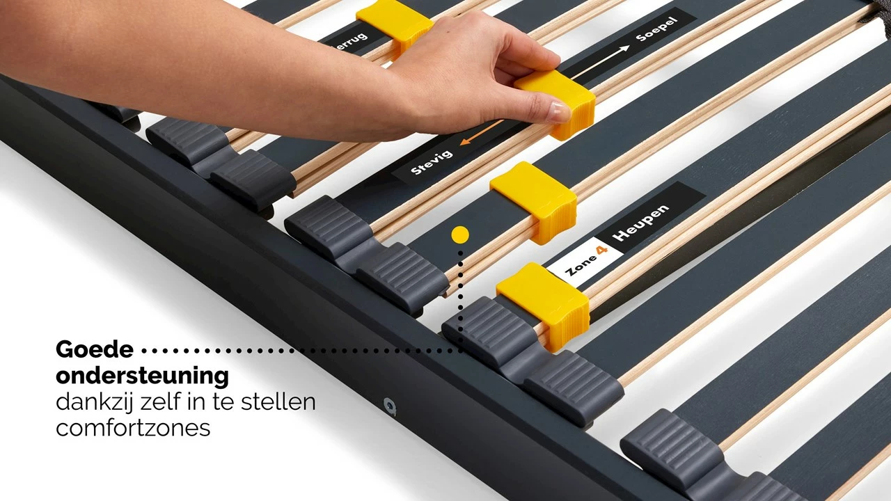 Met de Lattenbodem Bossflex 400 vlak haal je een goede lattenbodem in huis. De latten zijn gemaakt van solide beukenhout en zorgen voor een goede ondersteuning. Door een schuifmechanisme kun je heel eenvoudig extra veerkracht en ondersteuning creëren bij je schouders en heupen. De bodem is ook verkrijgbaar in de variant Lattenbodem Bossflex 400 handverstelbaar en Lattenbodem Bossflex 400 elektrisch verstelbaar bedraad.