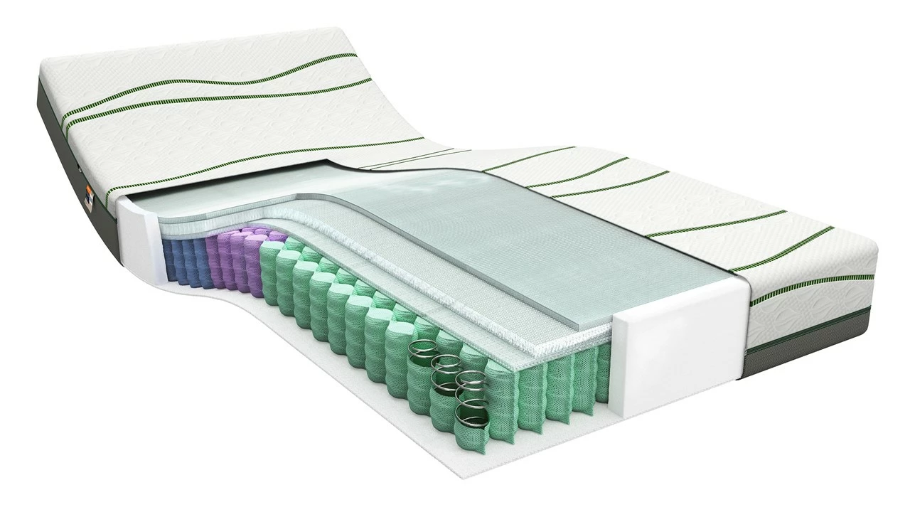 Dit circulaire matras is opgebouwd uit een basislaag van pocketveren, opgedeeld in 3 comfortzones. Het matras is 22 cm hoog en zorgt voor goede ergonomische ondersteuning op precies de juiste plaatsen van je lichaam. De Green Motion Circular heeft een EcoBreeze mesh toplaag van 4.5 cm. Deze bestaat uit drie elastische 3D lagen gemaakt van polyester. De lagen vormen zich perfect naar de contouren van het lichaam. Hierdoor ben je gegarandeerd van een goede en comfortabele nachtrust. De Green Motion blinkt uit in ventilatie door de open structuur. Zo blijft je lichaam gedurende de nacht op een aangename temperatuur. Daarnaast zorgt het 3D gebreide polyester voor een uitstekende vochtregulatie. Bacteriën en schimmels krijgen zo geen kans zich te nestelen. Dit maakt het matras dan ook zeer geschikt voor mensen met allergieën. De breedtematen 160- en 180 cm hebben één tijk (matrashoes) maar bestaan uit twee kernen.